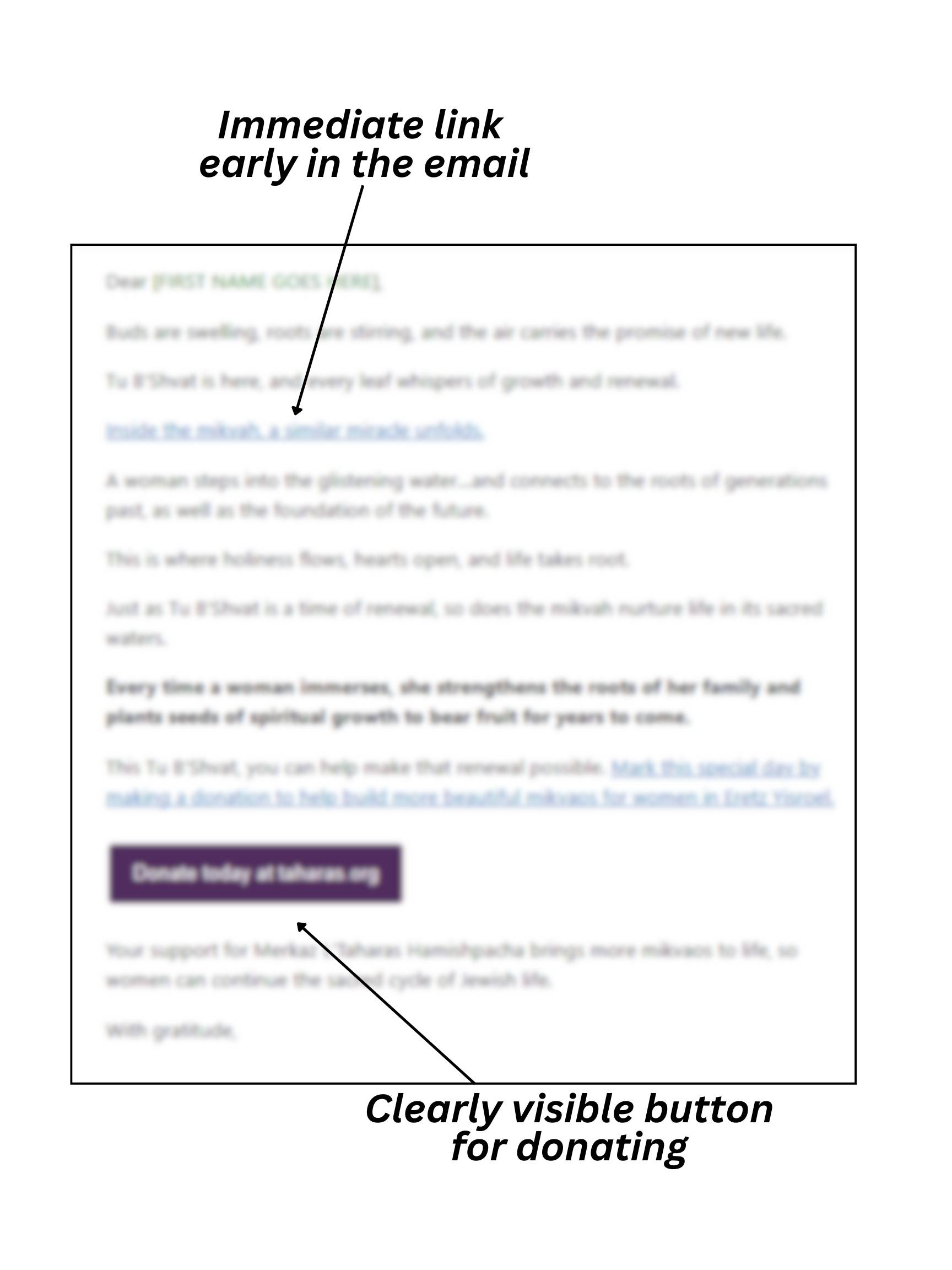 Donation requests are explicitly asking people for tzedakah. The CTA is strong – with the majority of the email based purely around that ask.
